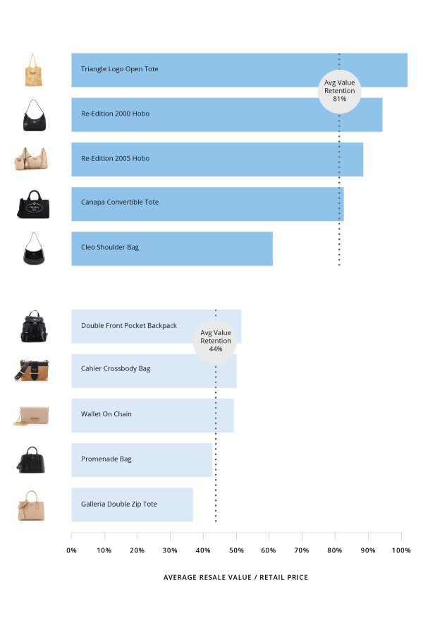 Although co-creative directors Miuccia Prada and Raf Simons did not introduce new handbag styles in 2023, the Italian brand remains in-demand, maintaining an impressive 57% average value retention this year. Using millions of data points on primary and secondary market pricing, demand, and trends, our 2023 Clair Report determined the Italian label’s top five styles in terms of value retention.
