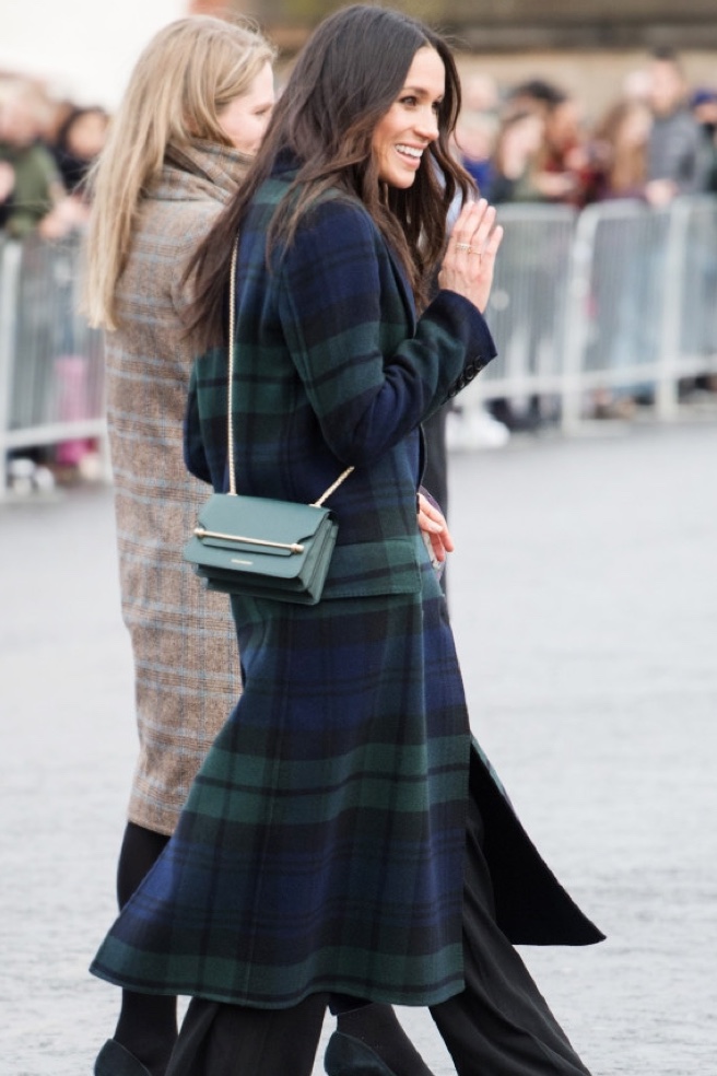 Meghan Markle waves at the crowd while wearing a Strathberry East/West Mini. (Harper’s Bazaar)