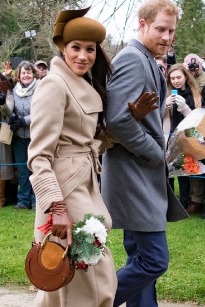 Meghan Markle clutches a round Chloé handbag. (Marie Claire)
