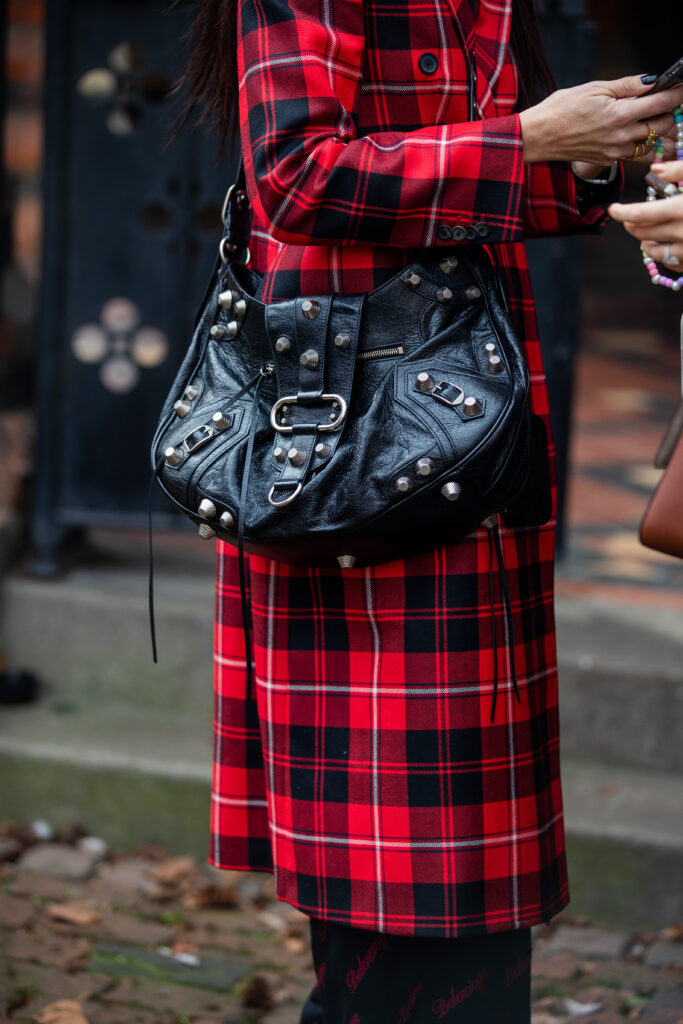A guest with a Balenciaga Le Cagole bag outside of Bora Aksu.