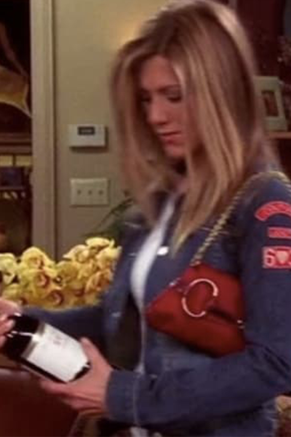Jennifer Aniston as Rachel Green in Friends wearing a red Gucci Horsebit Chain Clutch bag.