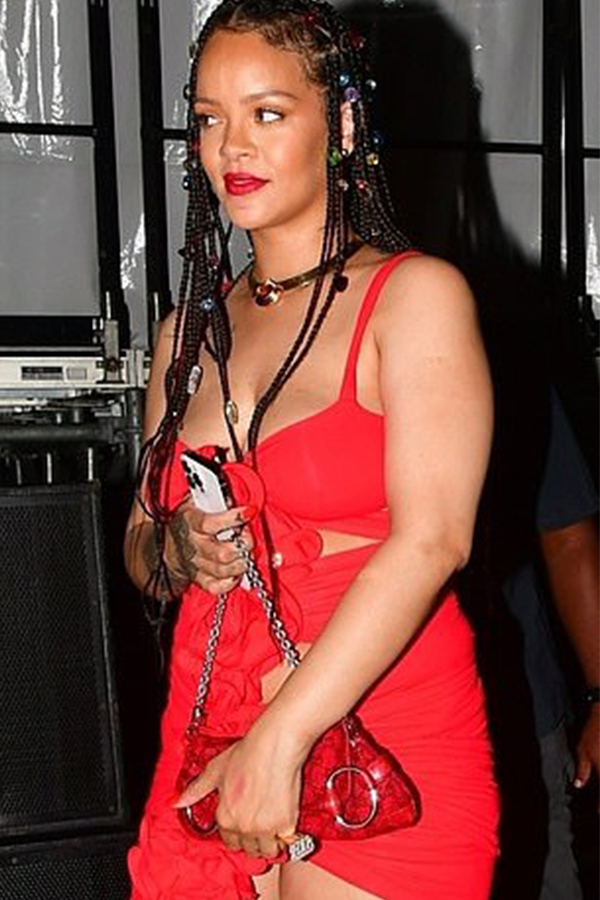 Rihanna carries a red velvet version of the Gucci Horsebit Chain Clutch in Barbados.