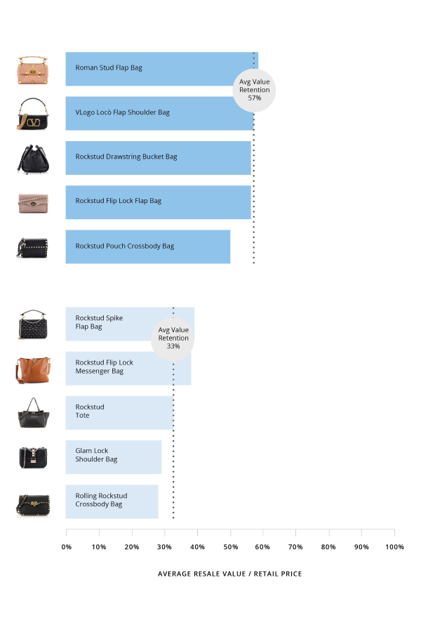 Perhaps one of the most coveted handbags by Valentino Garavani, the Roman Stud Flap bag comes out on top with an average retention value of 58%.