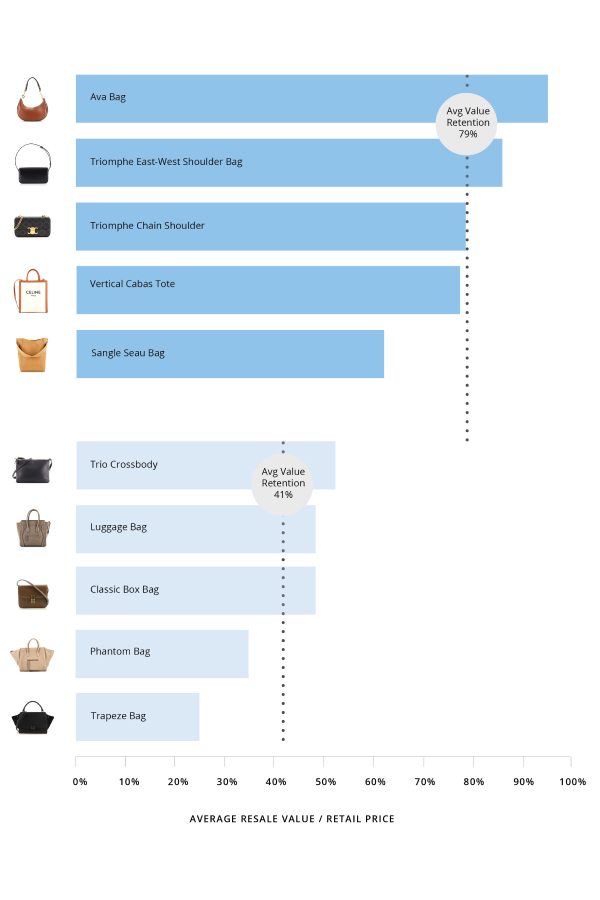 According to Rebag’s 2023 Clair Report, Celine holds an average 49% retention value. Using millions of data points on primary and secondary market pricing, demand, and trends, our Report determined the French label’s top five styles in terms of value retention.