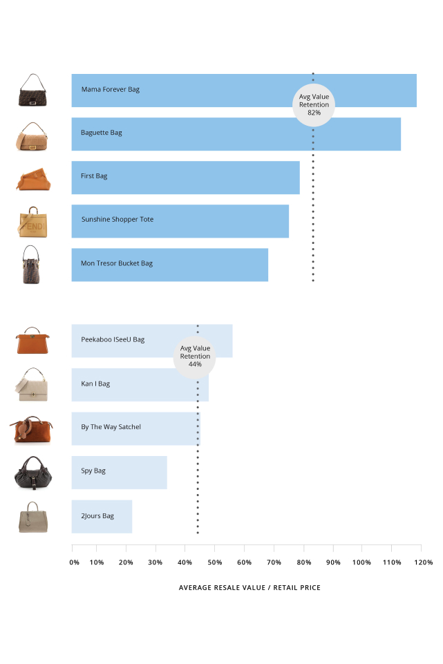 With a 57% average value retention, Fendi fits right into the Safe Bets zone (meaning the brand’s styles average between 55 to 85% of their retail price at resale). Using millions of data points on primary and secondary market pricing, demand, and trends, our 2023 Clair Report determined the Italian label’s top five styles in terms of value retention.
