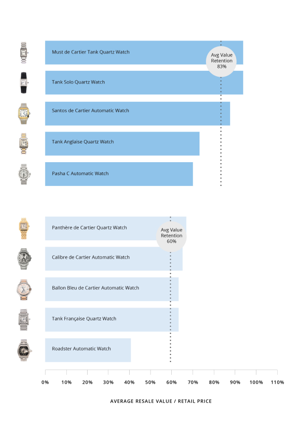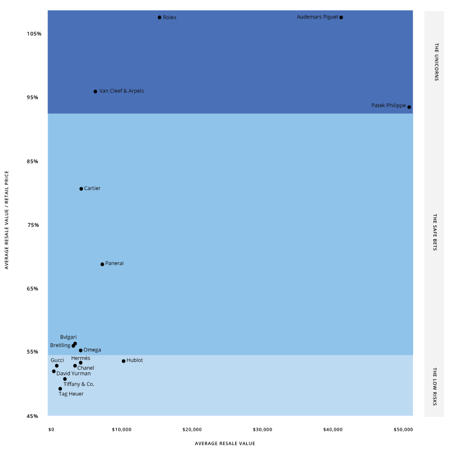 Utilizing data sourced from our proprietary tool, Clair, we calculated the average percentage of retained value in comparison to retail prices for the top timepiece and fine jewelry brands in the world. Read on to reveal the most worthwhile investments of the year.