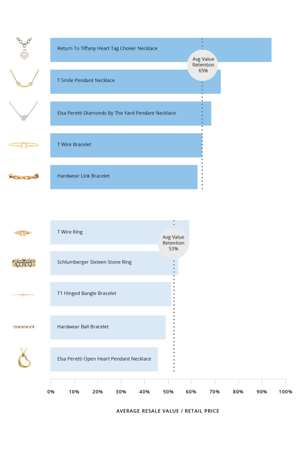 In the Spring of 2023, roughly two years after being acquired by LVMH, Tiffany & Co. reopened its iconic flagship location on NYC’s Fifth Avenue, to much fanfare. The event was a who’s who of the fashion and entertainment industries, with Anya Taylor-Joy, Gal Gadot, Zoë Kravitz, and Hailey Bieber among the attendees, further bolstering support for the American label’s new direction under LVMH’s Alexandre Arnault. With a 50% average value retention, certain styles are especially high performing, such as the Return To Tiffany Heart Tag Choker Necklace (94% average value retention), which was originally launched in the early 2000s but can likely attribute its lift to this summer’s Return to Tiffany x Beyoncé Collection, which brought the iconic style back in demand.