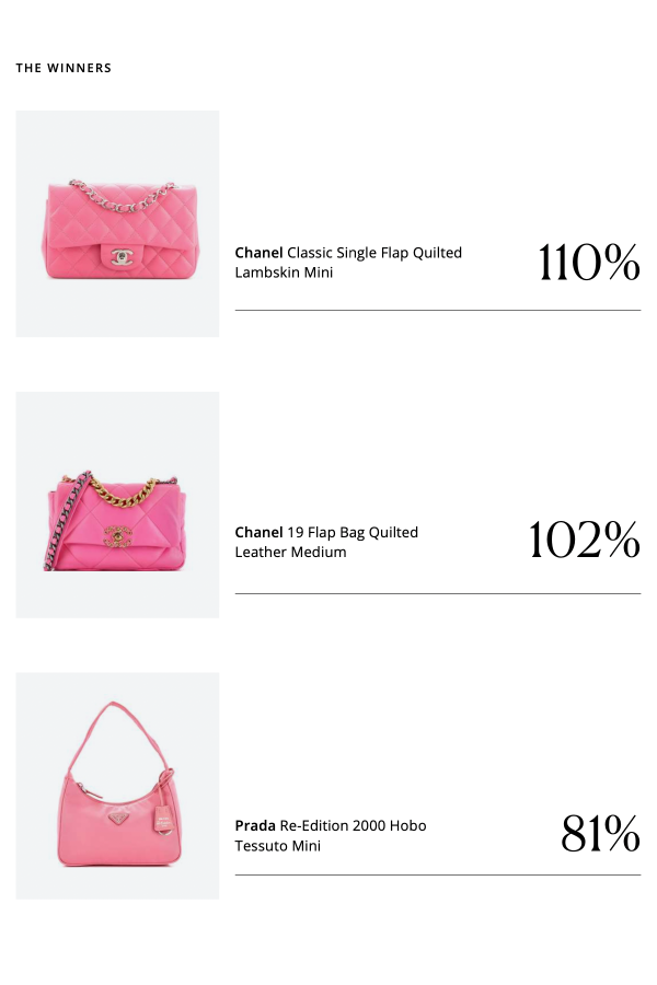 Beginning with the presentation of Pierpaolo Piccioli’s “Valentino Pink” collection in March 2022, the hue started gaining prominence. The following summer, during actress Margot Robbie’s global ‘Barbie’ press tour, pink apparel and accessories dominated. In 2023, pink handbags notably retained an average value of 81%, surpassing the 76% average value retention for all other colors combined. It’s no surprise that two of the top three magenta-hued styles of the year are by Chanel, which provided several of Robbie’s looks for the film and the red carpet.