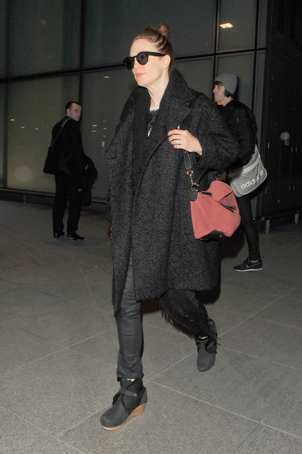 Julianne Moore arrives in Heathrow Airport carrying a Small Loewe Puzzle.