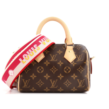 As the third smallest size, the Speedy 20 is 8” inches wide, 5.1” inches tall, and has a depth of 4.7” inches. The Speedy 20 can fit your keys, wallet, phone and phone charger, and Airpods. It has a handle drop of 3” inches and a strap drop of 20” inches, so it can be worn as either a shoulder or crossbody bag.